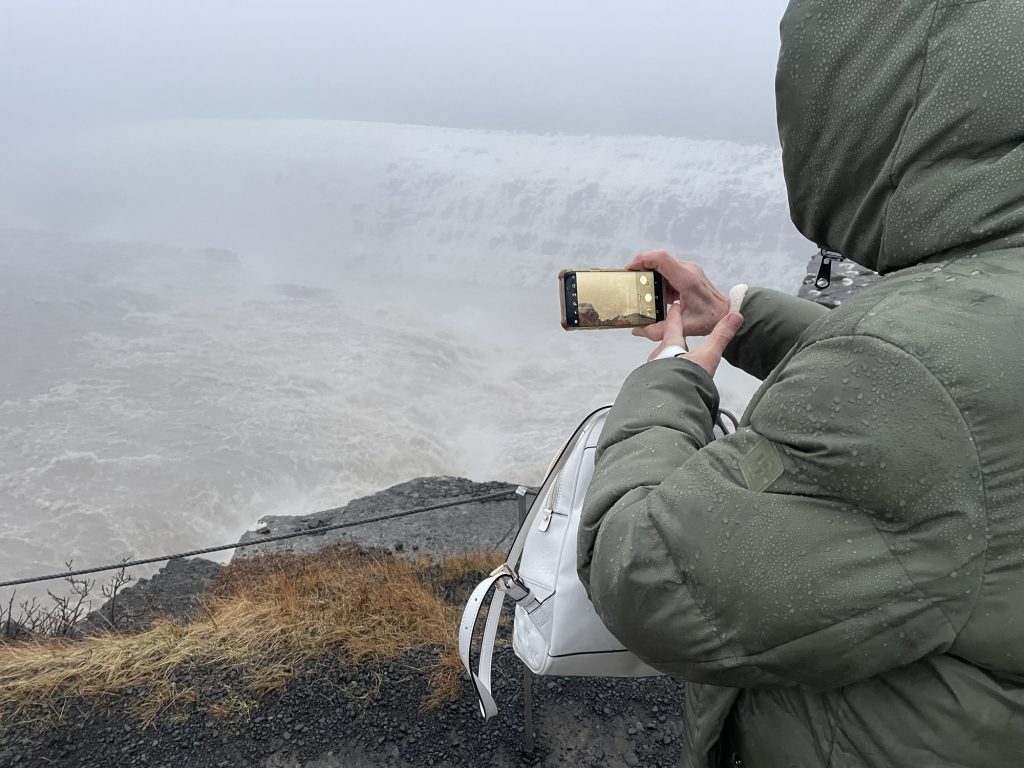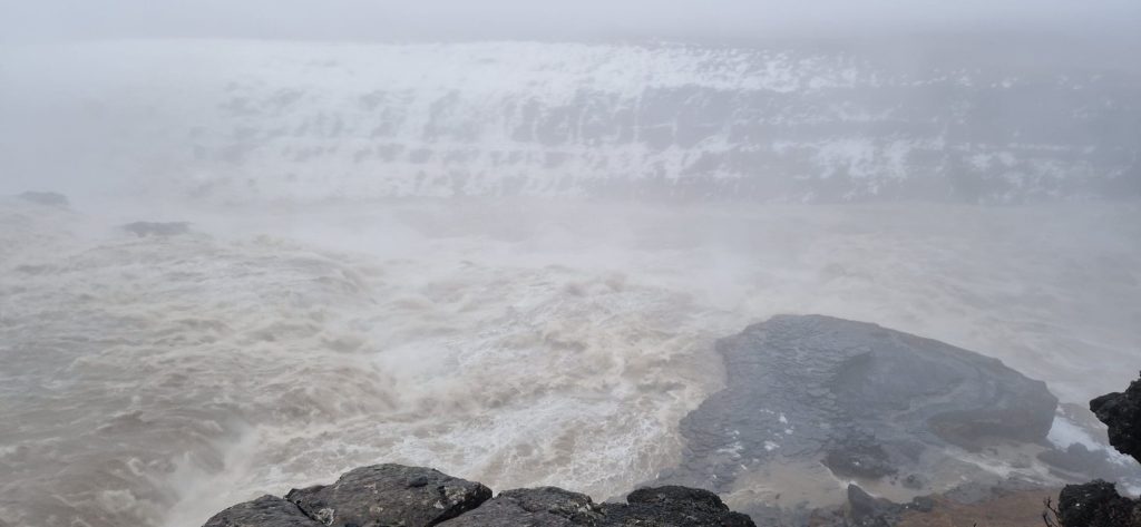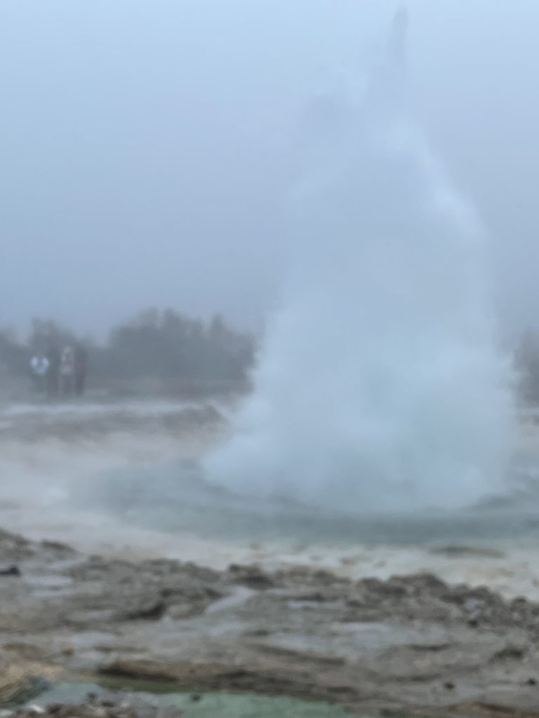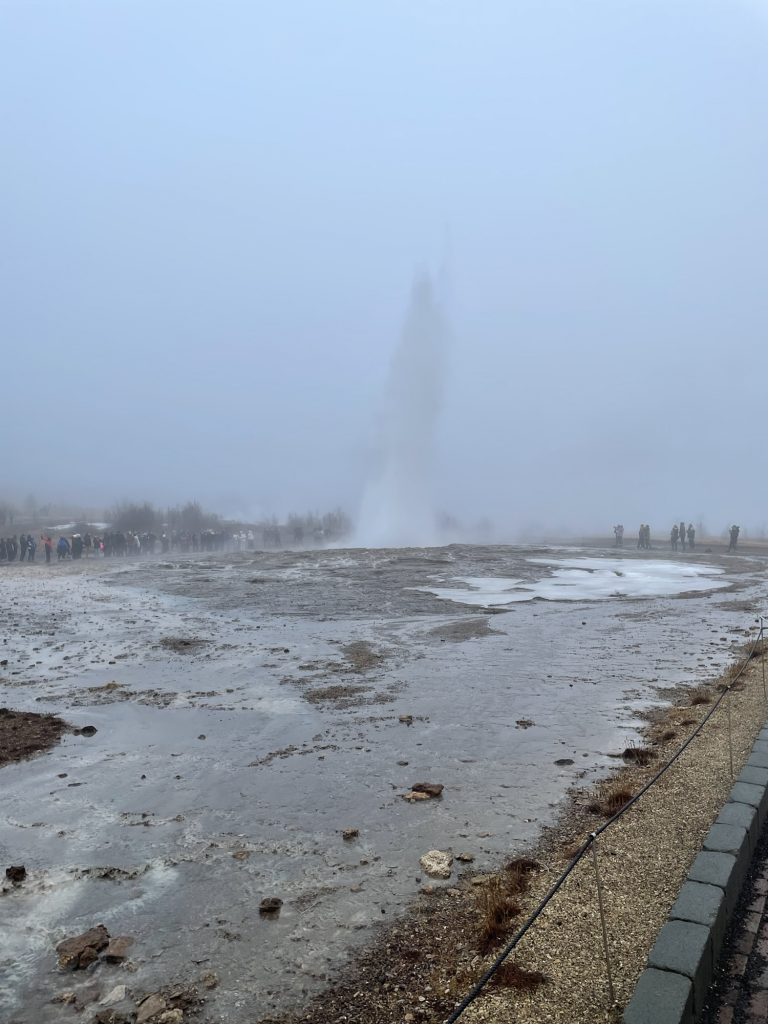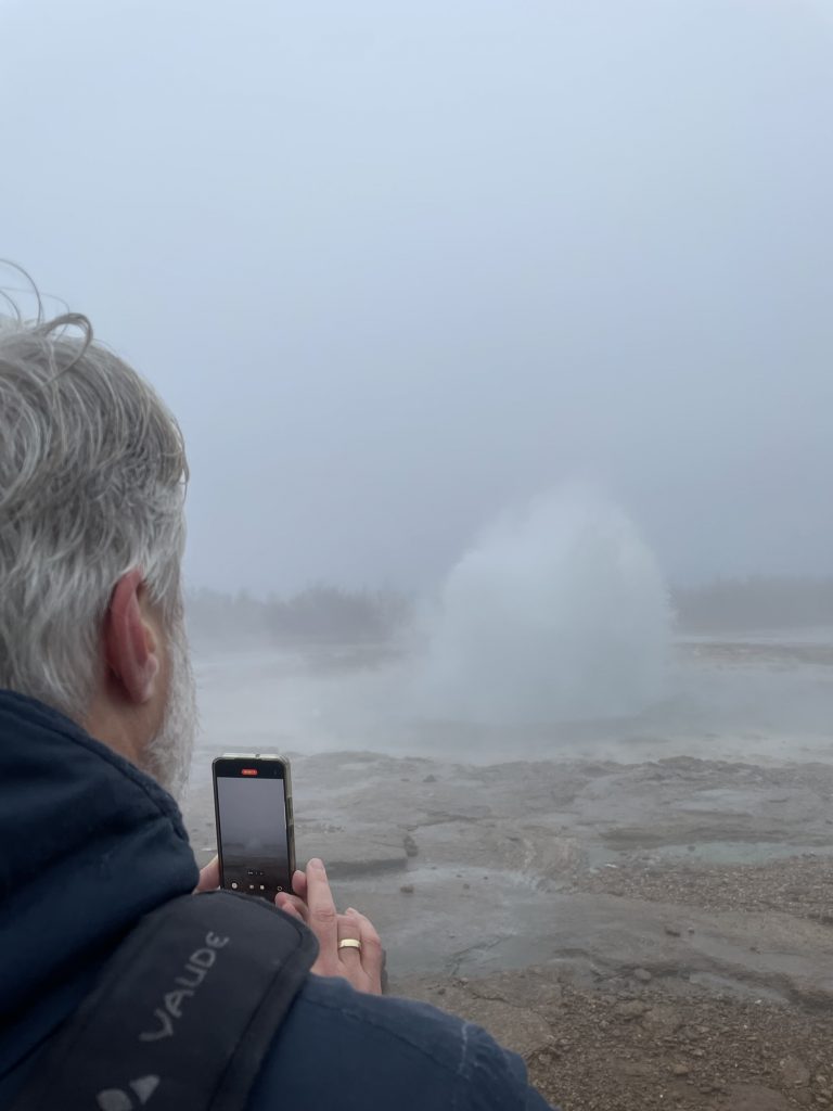 Am Wasserfall Gullfoss mischen sich Gischt und Nebel. Der Geysir spuckt mit heißem Wasser.